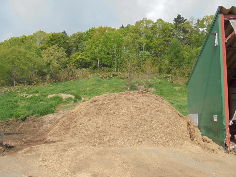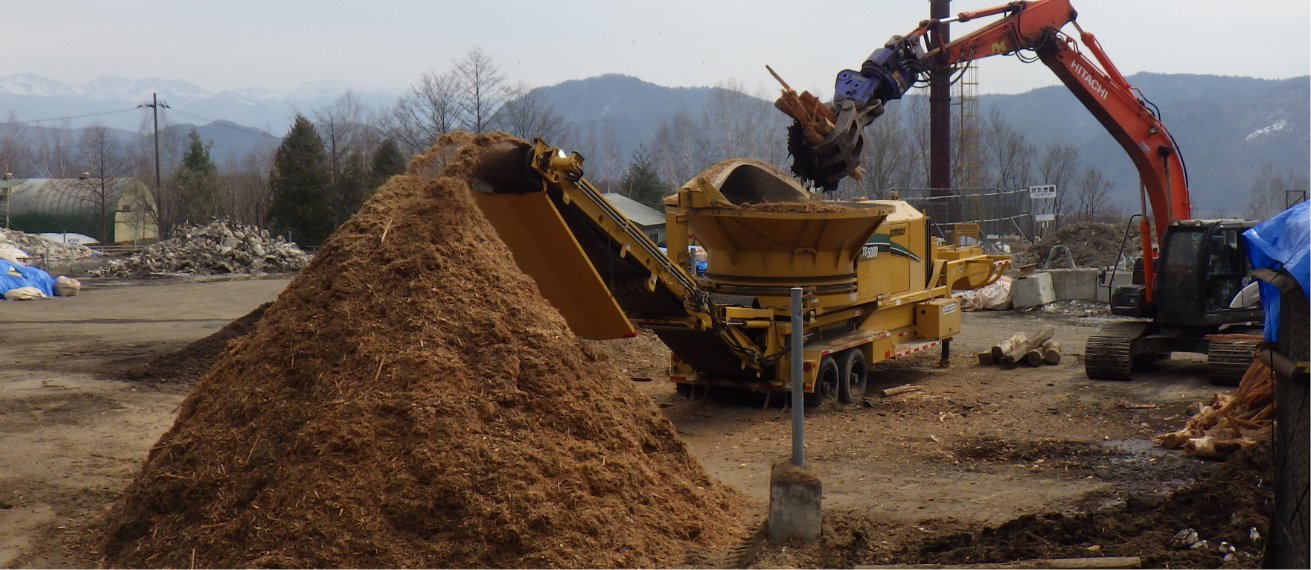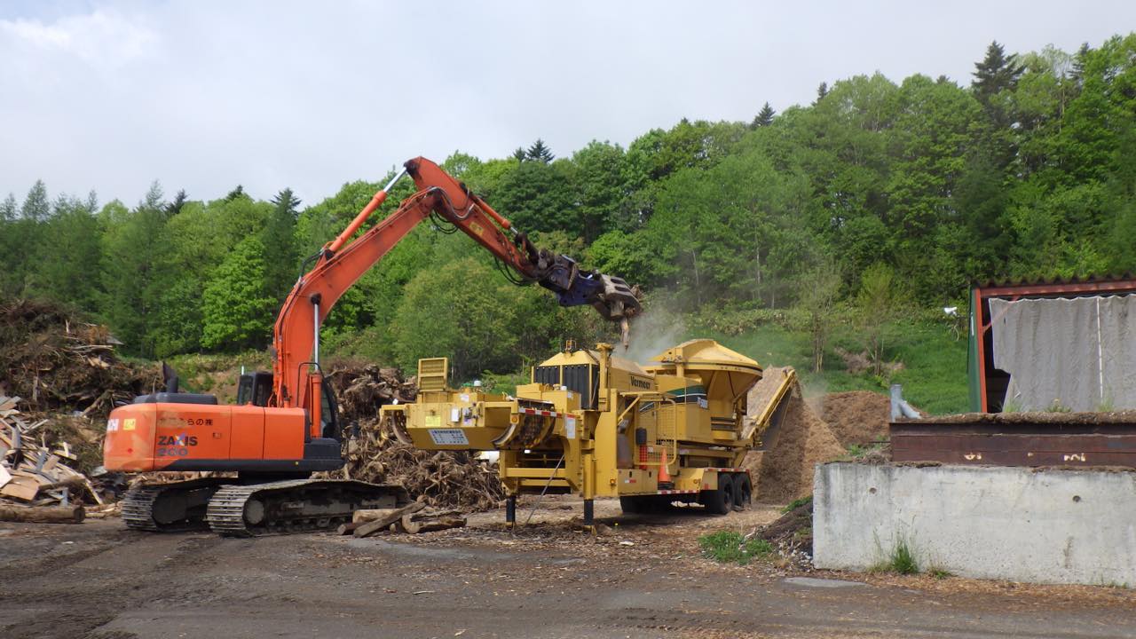 市内事業所や近隣町村で発生した枝草類・選定枝・伐根から再生資源(破砕チップ等)を製造しております。受入したものは異物除去を行い、破砕装置で細かく裁断して堆肥原料及びボイラー燃料材、家畜用敷藁に利用されております。